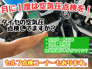 タイヤ交換後の点検はお済みですか? 早い方だと10月ごろ交換されたかと思いますが、 その頃と今では外気温が違います。 その為、タイヤの内圧にも変化が出やすいです。 年末年始のお出かけ前には、 空気圧!ナットの増し締め!お忘れ無く! もちろんタイヤの残溝、ゴムの硬さのチェックもお忘れ...