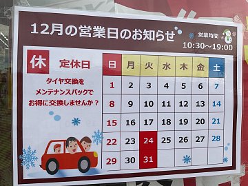 もちろんタイヤ交換はお済ですね? 年末年始前のメンテナンスはお早めに! 明日、12月24日火曜日 誠に勝手ではございますが定休日となります。 タイヤ交換、メンテナンス、アライメント調整等のご予約は アプリ、WEBでも承っております。 あ タイヤ購入予約は、 Moboxもご利用いただけます。...