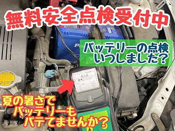 お車の点検はされてますか? 『点検ってお金掛かるんじゃないの・・・?』 そんな心配無用です! タイヤ館の無料安全点検は、『 無料です!』 タイヤはもちろん!オイル、バッテリー、ワイパーなど 無料で点検いたします! 交換サイクルが長いバッテリーはこまめな点検で 安心ドライブしましょう! ...
