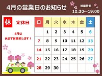 4月の定休日をお知らせいたします。 4月は、お休みなく営業致します。 また、4月21日(日)まで 10:00~19:00までと営業時間を変更しております。 夏タイヤへの交換で混み合う時期ではありますが、 WEBからの予約も承っております! 4月も皆様のご来店お待ちしております。