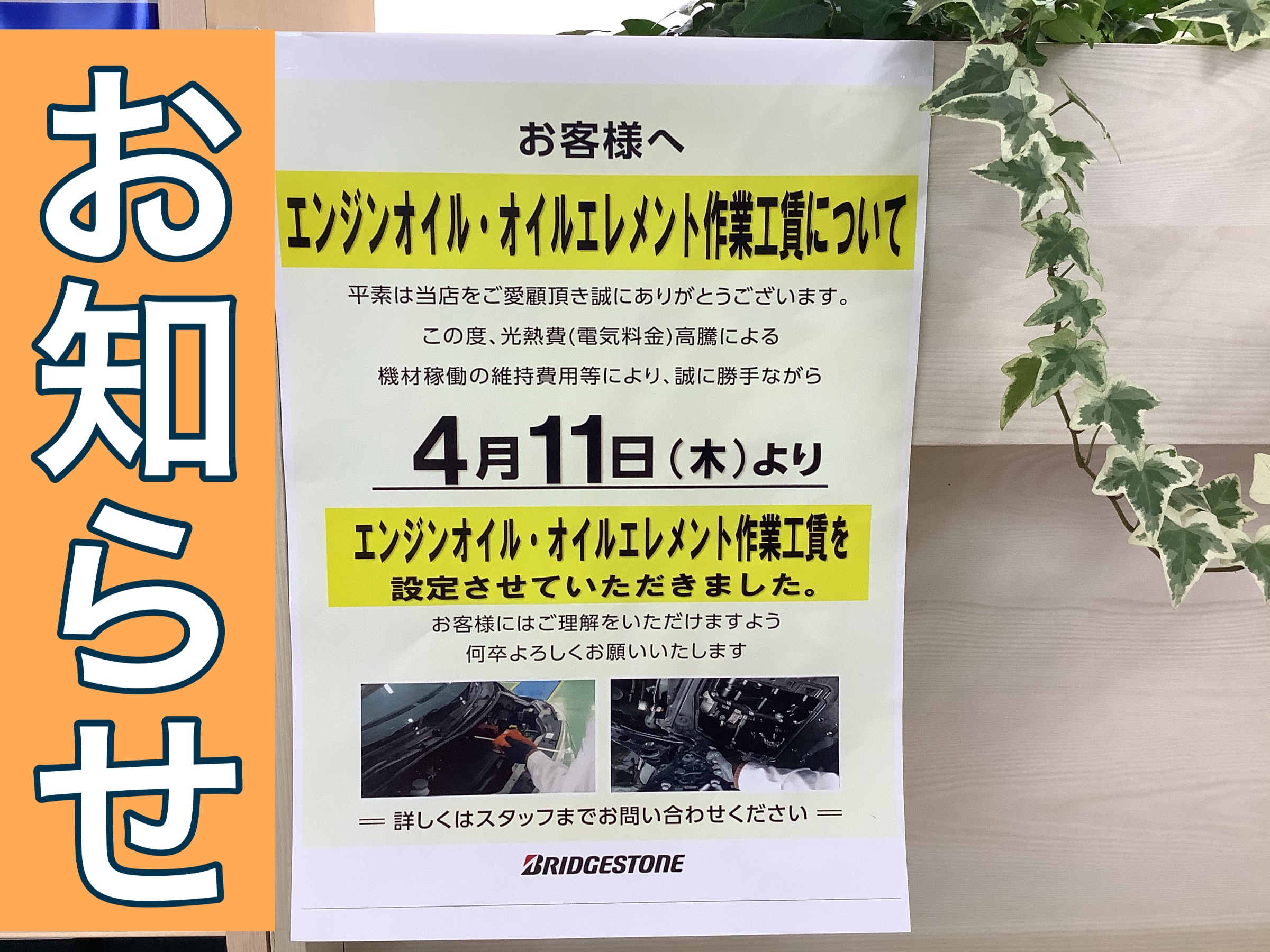 誠に勝手ながらこのたび、4月11日(木)より エンジンオイル交換・オイルエレメント交換の 作業工賃を設定する事となりました。 ご迷惑おかけしますが宜しくお願い致します。