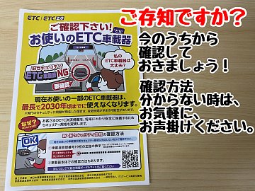 記事一覧 ETCの確認をお願いします。 ご存じですか? 今お使いの、【 ETC 】もしかすると使えなくなるかもなんです。 【 セキュリティ強化の為 = ご利用になるお客様の為 】 ETC車載器の交換が必要になるかもしれません。 今お使いの【 ETC 】が大丈夫なのか?ダメなのか? 分からなかったら、ご確認のお手伝いいたします。 お気軽に、... 2026年4月22日 ポスト