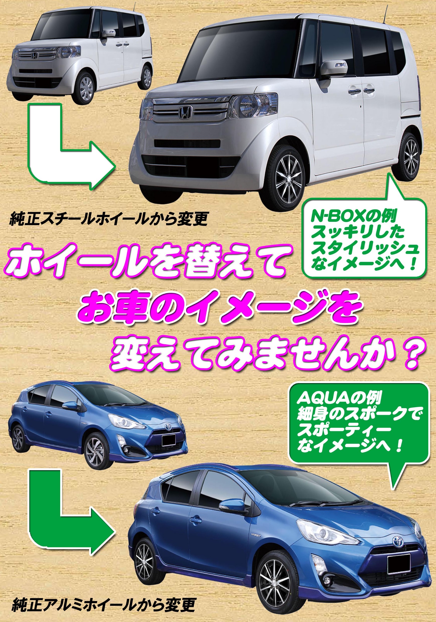 スチールホイールをお使いのお客様はもちろん、現在アルミホイールをお使いのお客様も、お車のイメージチェンジに交換してみてはいかがですか?