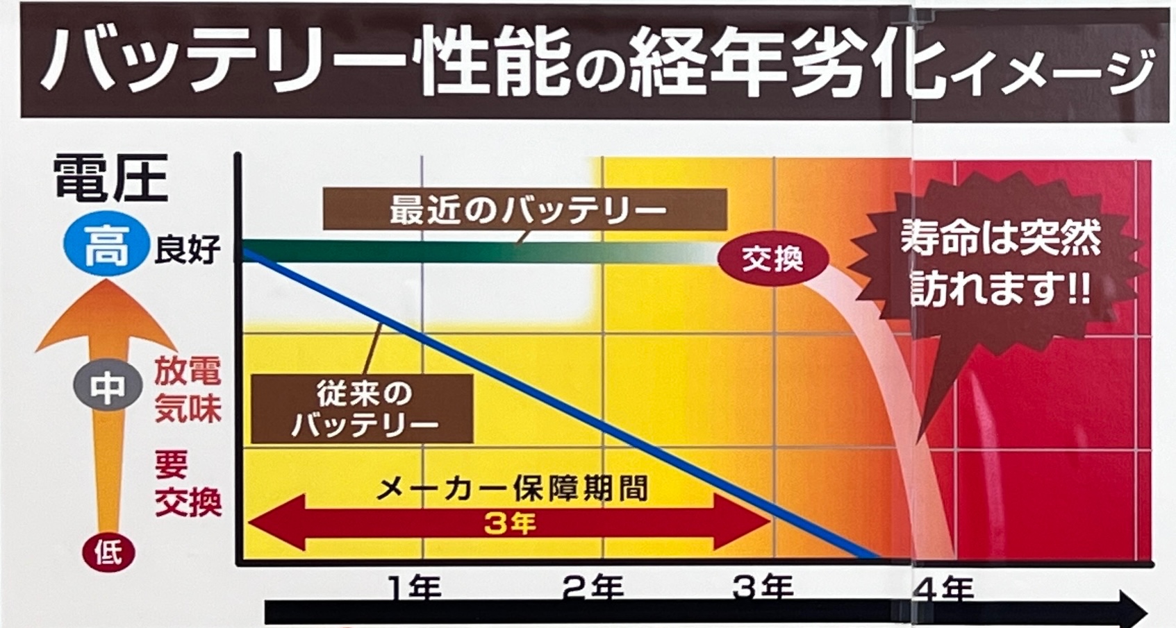 今のバッテリーはメーカー推奨で3年毎の交換をオススメしております。