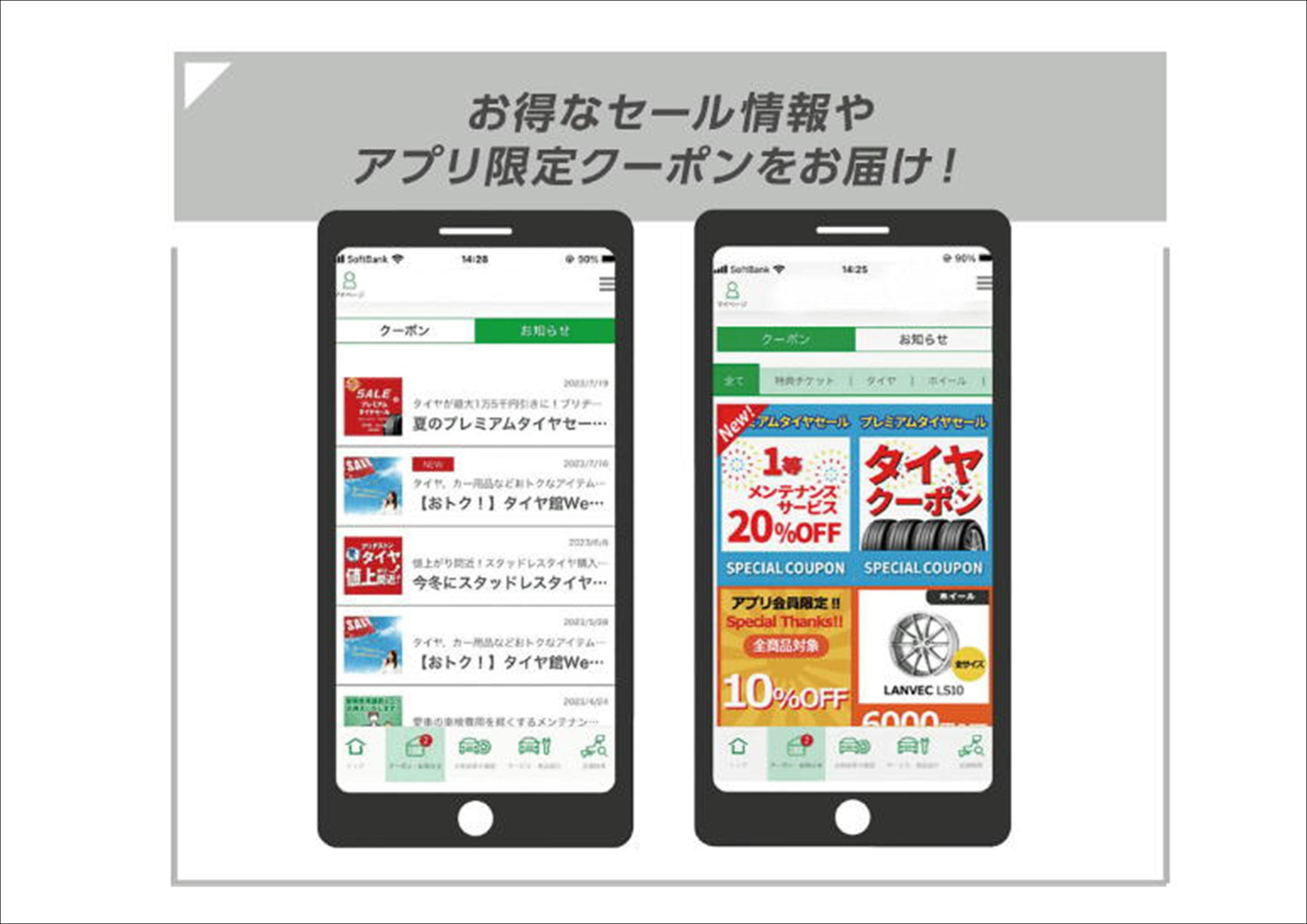 また、タイヤ館のアプリに加入して頂くとスマートフォンからでも
