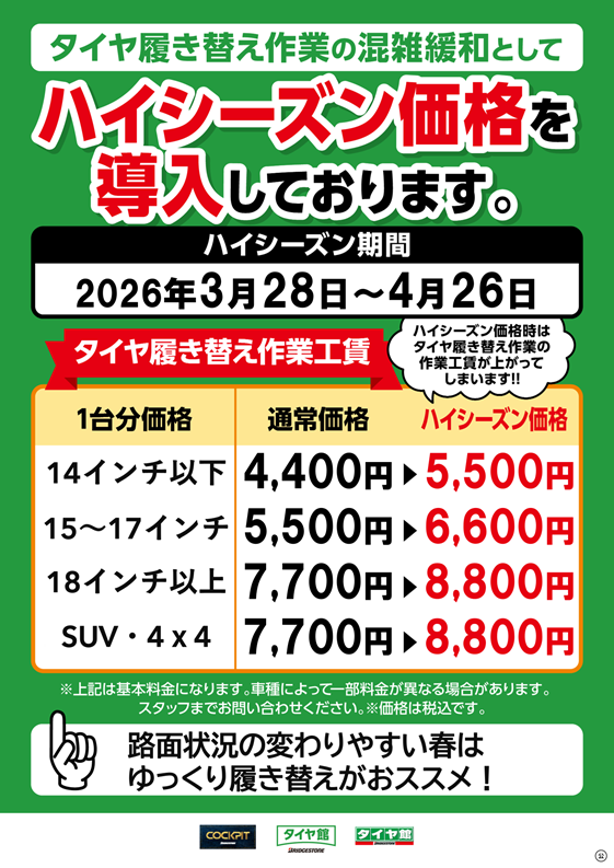 コクピット・タイヤ館は“平日”がお得!『平日割』実施中!