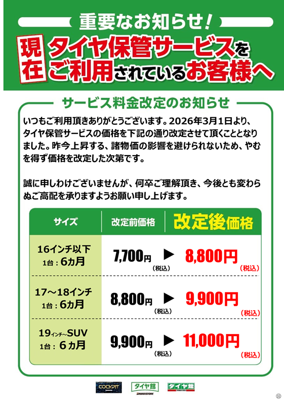 【タイヤクローク料改定のお知らせ】 2026年2月28日 いつもご利用頂き誠にありがとうございます。 2026年3月よりタイヤ保管料の価格を改定させていただく 運びとなりました。 昨今の諸物価の高騰の影響を避けられないため、やむを得ず 価格を改定した次第です。 誠に申し訳ございませんが、何卒ご理解をいただき 今後とも変わらぬ高配を承りますようお願い申し上げます。
