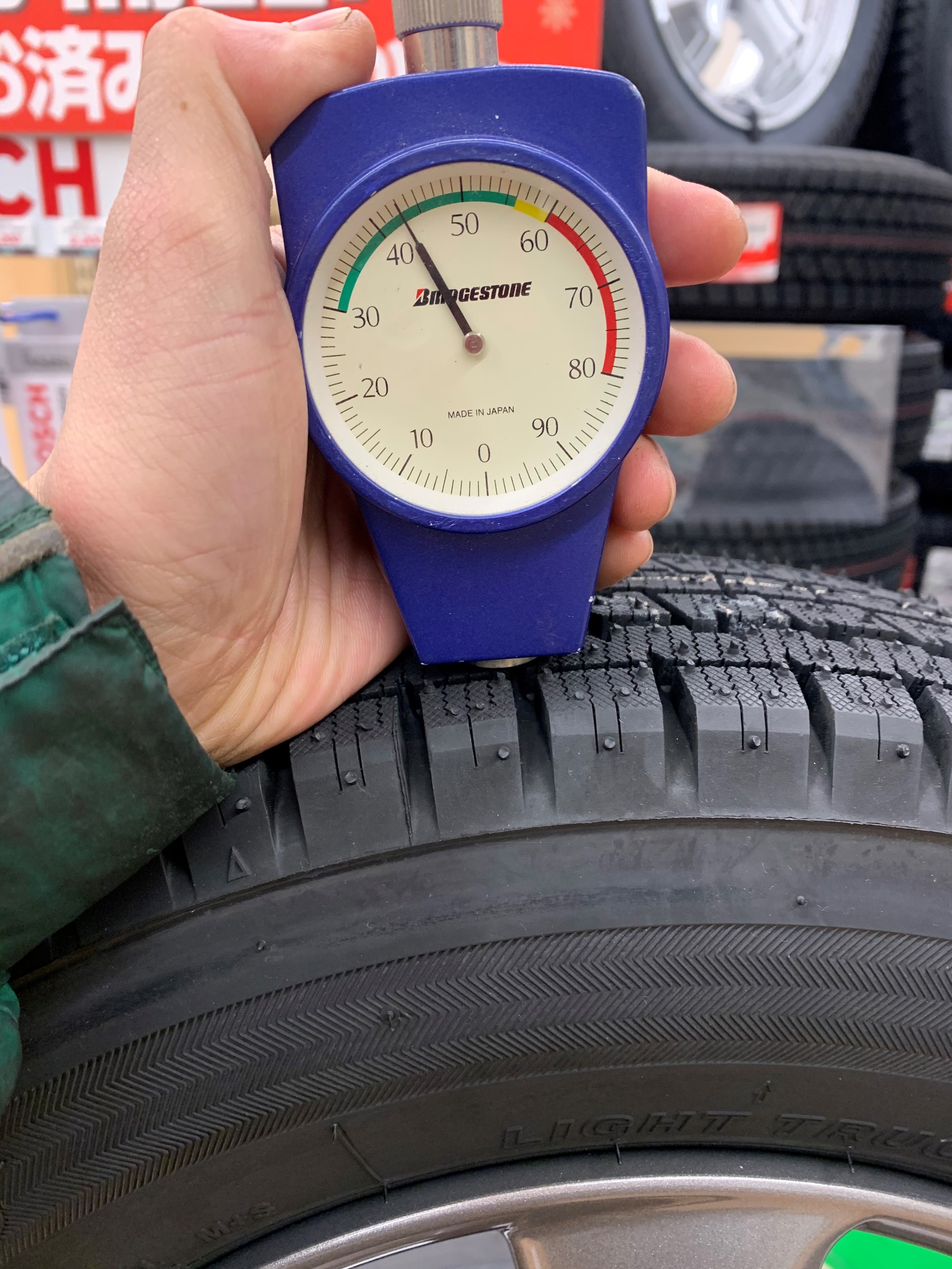 溝や年数、硬さの点検を専用の器具を使用して点検致します!