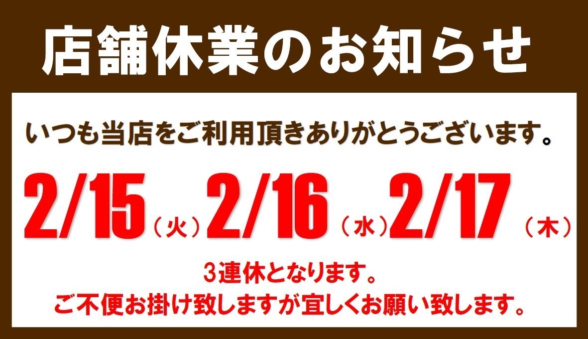 2/15(火)~2/17(木)3連休となります。