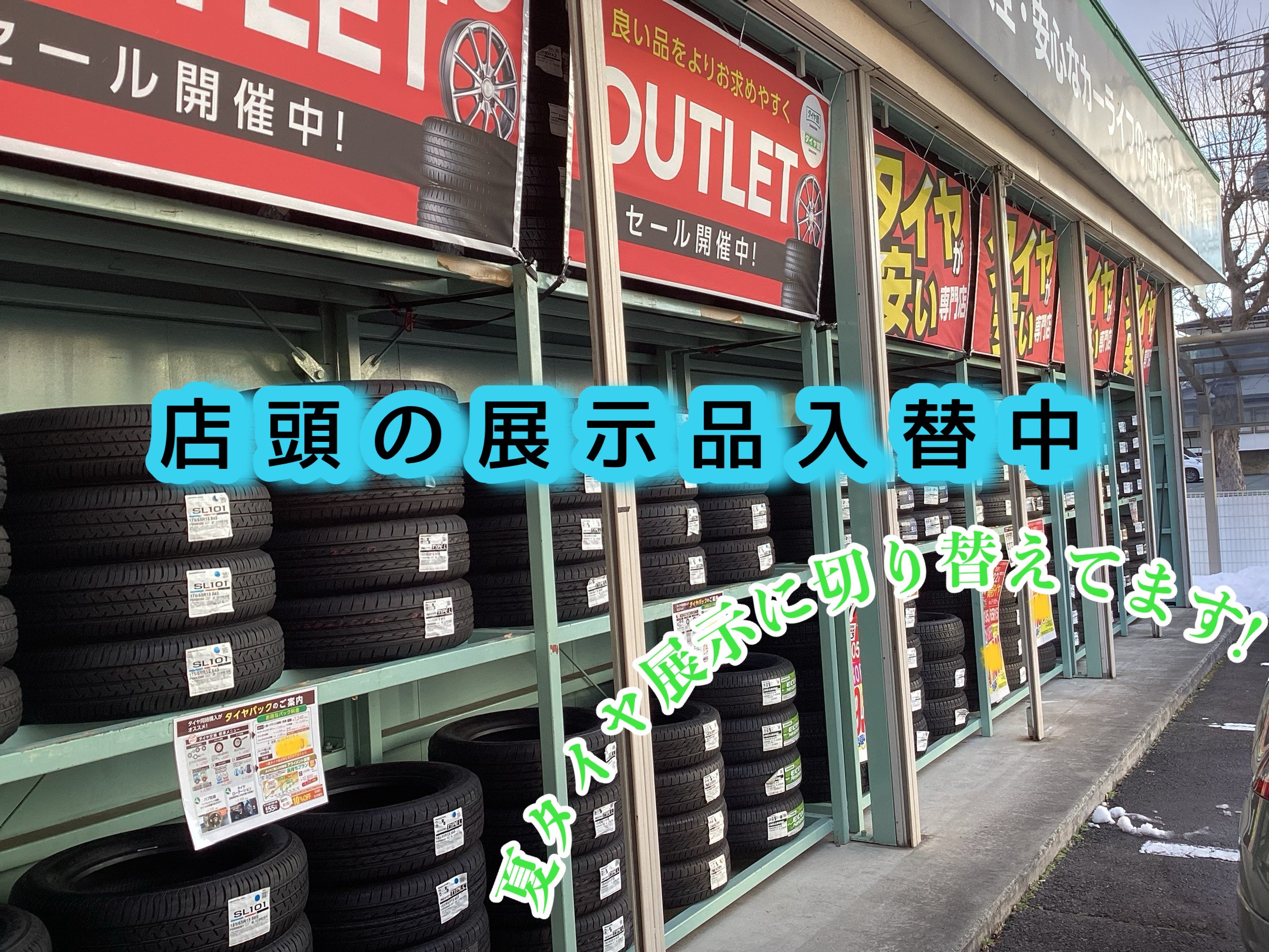 外にある大きなガレージには、アウトレット品の夏タイヤを展示しております^^