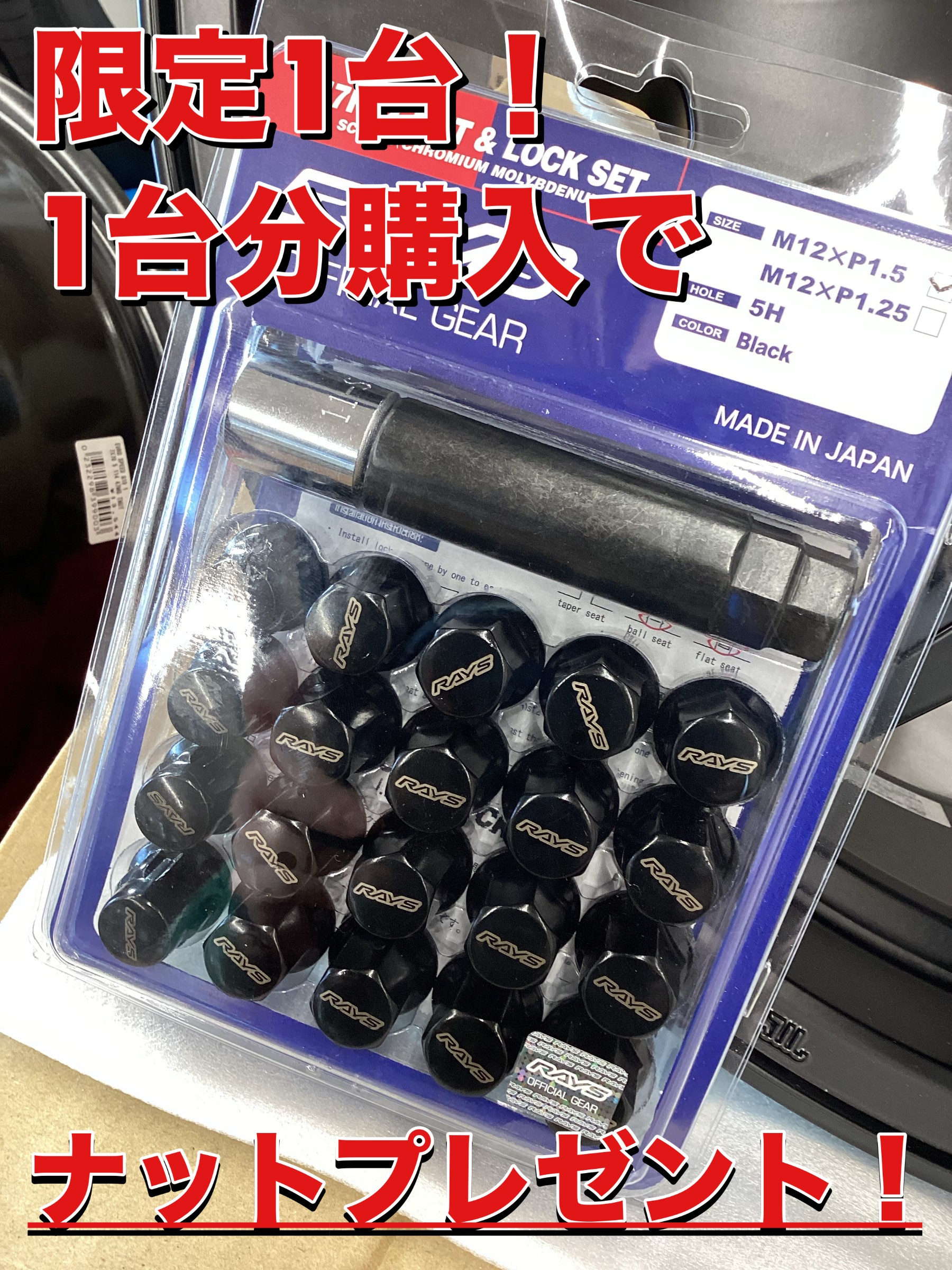そしてなんと!この1台分に限り、購入いただくとRAYSのナット&ロックセット1台分