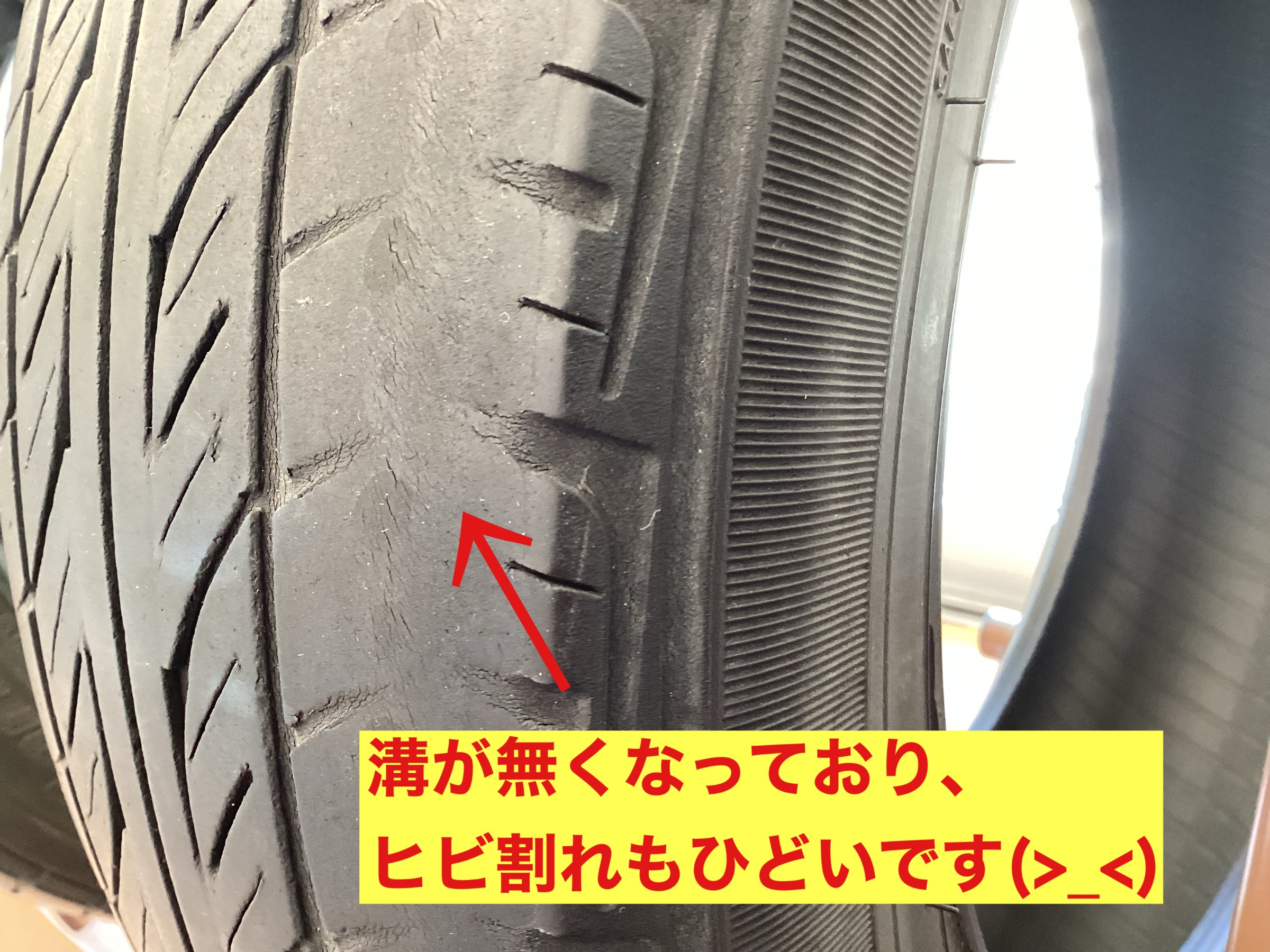 こちらの写真はスリップサイン(溝の中の盛り上がり部分)が出てきてしまい、使用不可の状態となっているタイヤです。