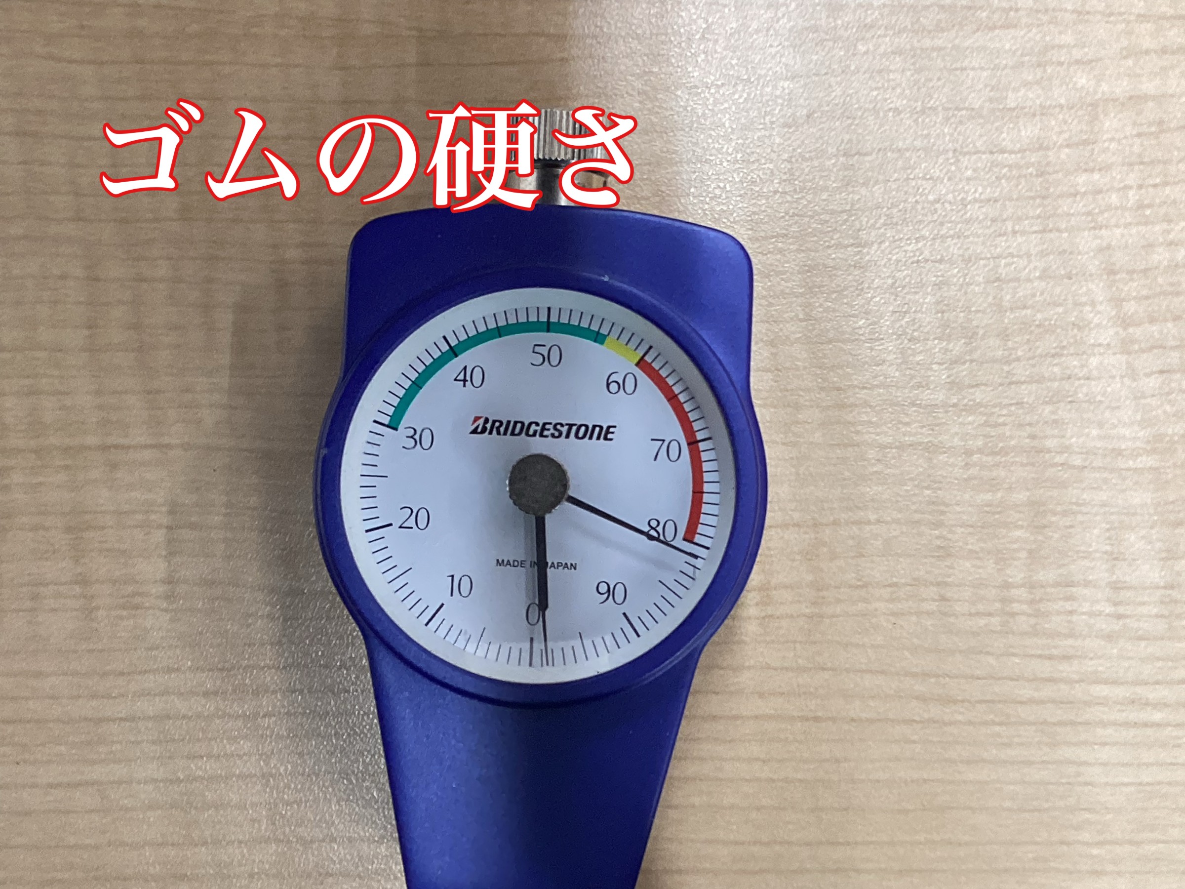 こちらの専用の器具をゴムに押し当てて硬さをはかります。