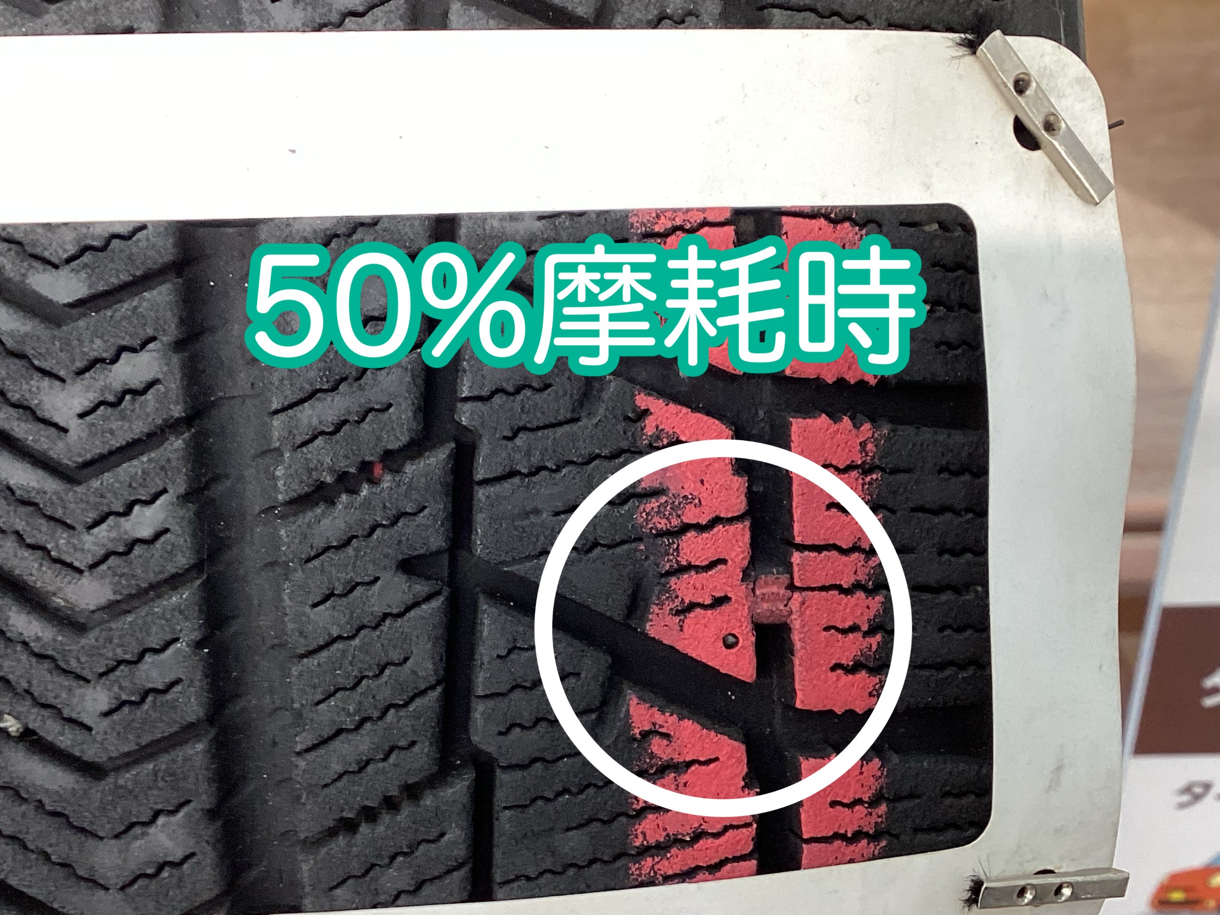 こちらまで減ってしまうとスタッドレスタイヤ使用限度まで到達して交換の目安を迎えます。