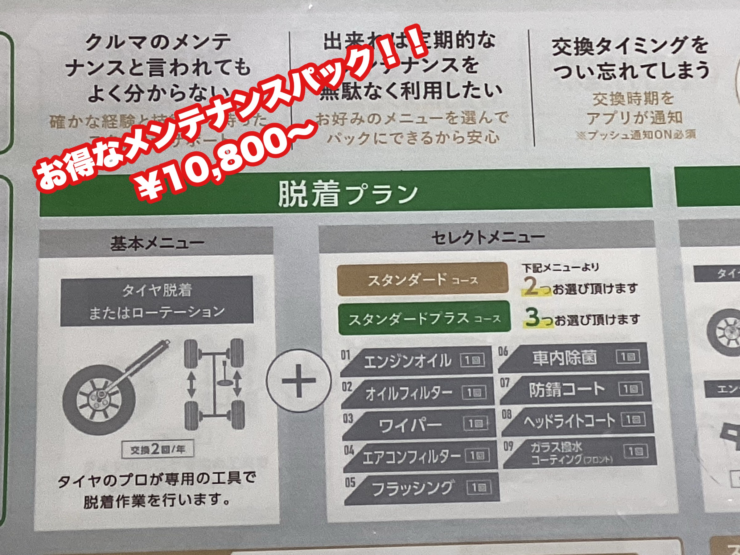 タイヤ履き替え作業工賃について ポスト 2024年11月21日 いつもご利用いただきありがとうございます。予約が取りづらく大変ご迷惑をお掛け致しております。 タイヤ履き替え作業工賃が12月8日(日)まで ↓ ↓以下の料金となっております。 オトクなメンテナンスパックはいかがでしょうか?タイヤ履き替え2回と選べるセレクトメニューがついて大変お得!!ご利用ください(^^)/ 担当:矢口