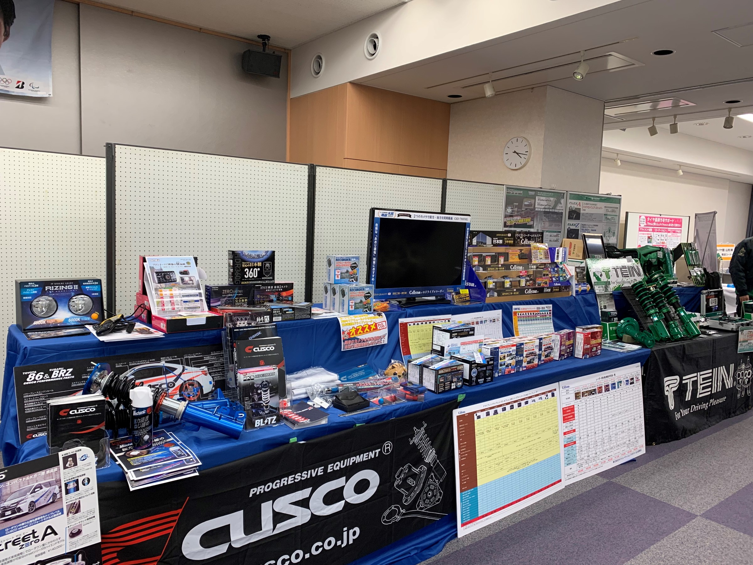 写真にある通り、当日は話題のドラレコやベロフのLED関係や車高調&試乗車の準備も
