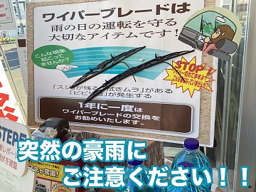 梅雨時期に入りました。突然の雨にご注意ください(^^)/ 視界良好ですか? ワイパーのゴム切れ、ビビりありませんか? 早めに交換押しておけば、安心ですよ 点検のご来店お待ちしております(^^)/