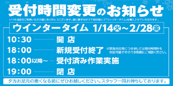 タイヤ館城西より【受付時間変更のお知らせ】 いつも当店をご利用いただき誠にありがとうございます。 誠に勝手ながら1月14日(火)から2月28日(金)まで 受付時間の変更(ウィンタータイム)を導入させていただきます。 期間:1月14日(火)から2月28日(金) 期間内各種時間 10:30・・・・・開...