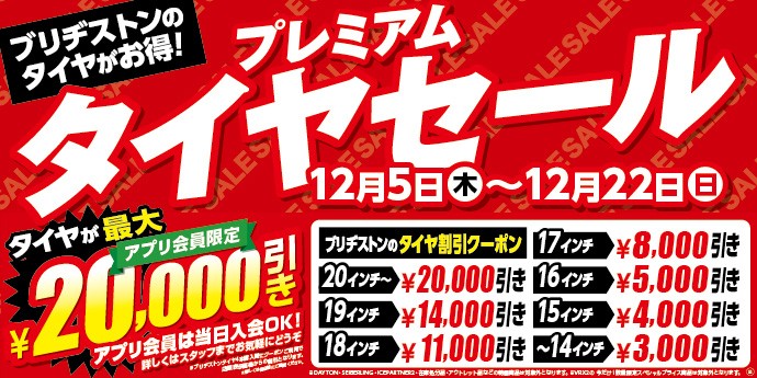 【タイヤ最大20,000円引き】決算在庫一掃&プレミアムタイヤセール★★12/5(木)から開催★★