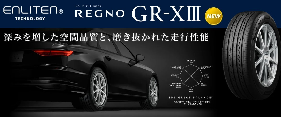 ついに待望のブリヂストン フラッグシップモデル REGNO GR-XⅢ [レグノ ジーアール・クロススリー] が発表になりました! 2024年2月よりサイズごとに順次発売予定です! GR-XⅢは新ゴム“GR-tech Silentゴム”の搭載により 振動を吸収しロードノイズを更に低減! 新品比較での騒音逓減率は先代GR-XⅡに対し...