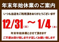 早くて今日で年内最後の営業となりました。 今年も多くのお客様にご利用いただき、賑やかな一年を過ごすことができました。 2024年は1/5からの営業となりますが、一部変則的な定休日や営業時間短縮を予定している日 もありますので【ショップからのお知らせ】をご確認ください。 今年もご利用いただ...