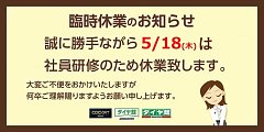 5/17(水)定休日 誠に勝手ながら5/18(木)は 社員研修の為休業致します。 大変ご不便をお掛けしますが、 何卒ご理解賜りますようお願い申し上げます。