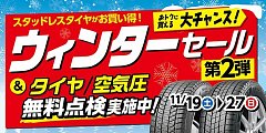 只今、ウインターセール第2弾開催!! スタッドレスの交換はお済ですか? 「そろそろ交換かな?」めやすが分らない?? そんなあなた。1本だけでも良いのでお持ちください。 タイヤ点検いたします。 ご自分でタイヤ交換なさったかたは、空気圧点検実施中です!(^^)!