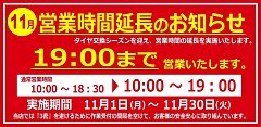 11月1日(月)~11月30日までの期間中 タイヤ交換の繁忙期になる為 営業時間は10:00~19:00までとなります。 作業受付時間と営業時間は異なりますので予めご了承くださいませ。 尚、期間中は定休日はなしで営業となります。