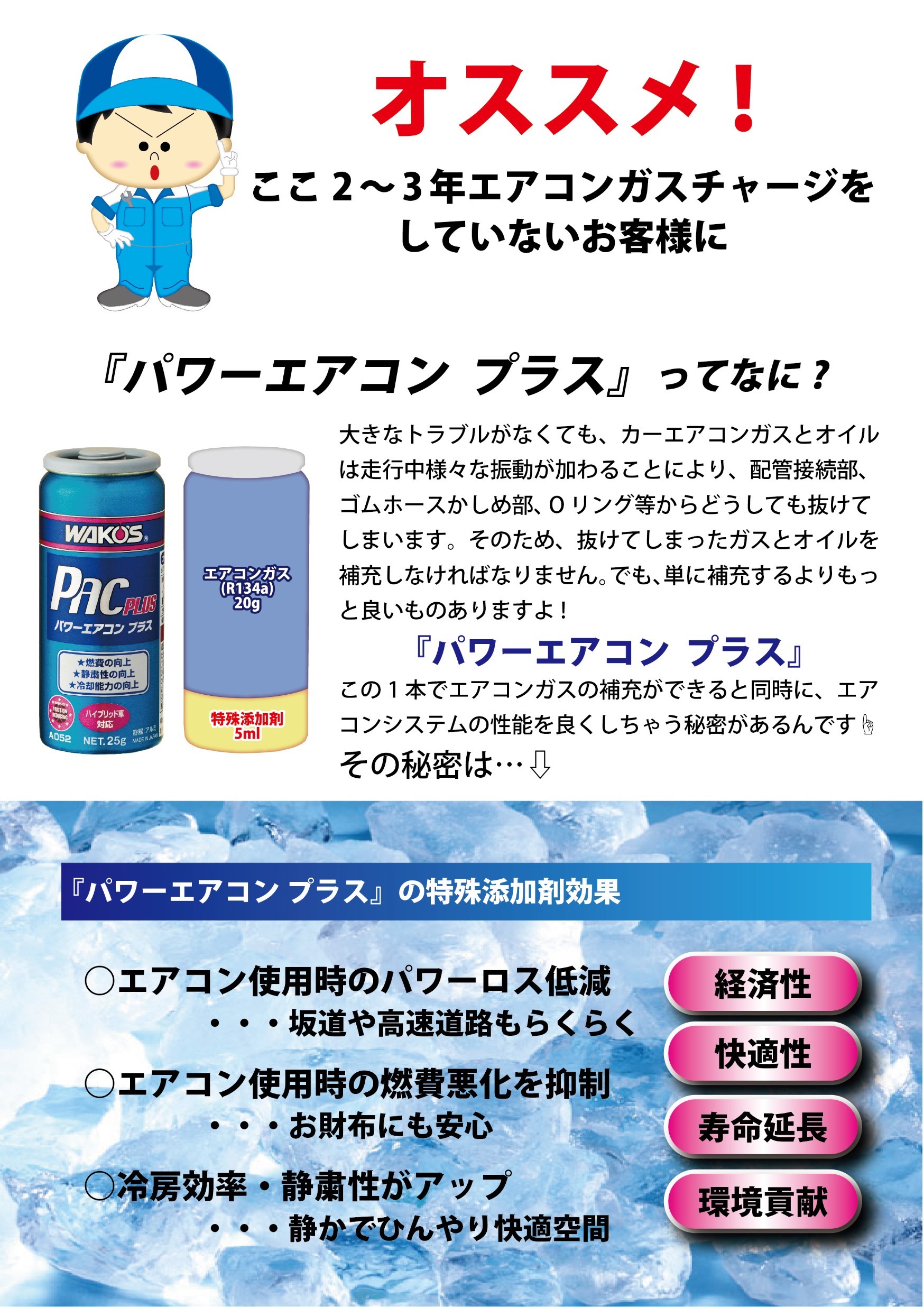 より快適にお乗りになる為にエアコン関連商品のご検討は いかがでしょうか!? WAKO'Sパワーエアコン プラス(添加剤)などでこの夏を 快適に乗り越えてみませんか? また、エンジンオイル交換やよりお得なパックの販売等も させて頂いております♪