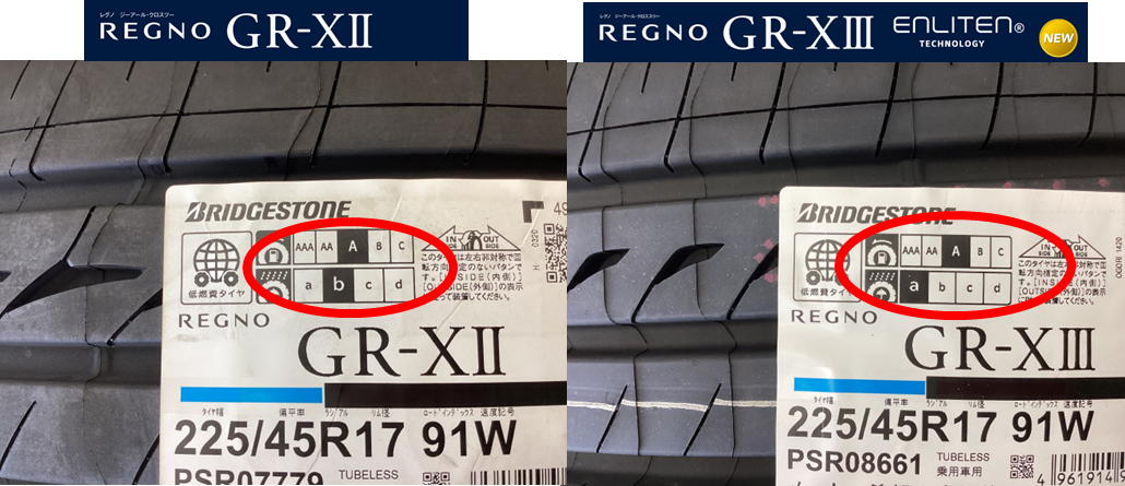 GR-XⅢはよりREGNOロゴ、ブリヂストンの「B」マークの