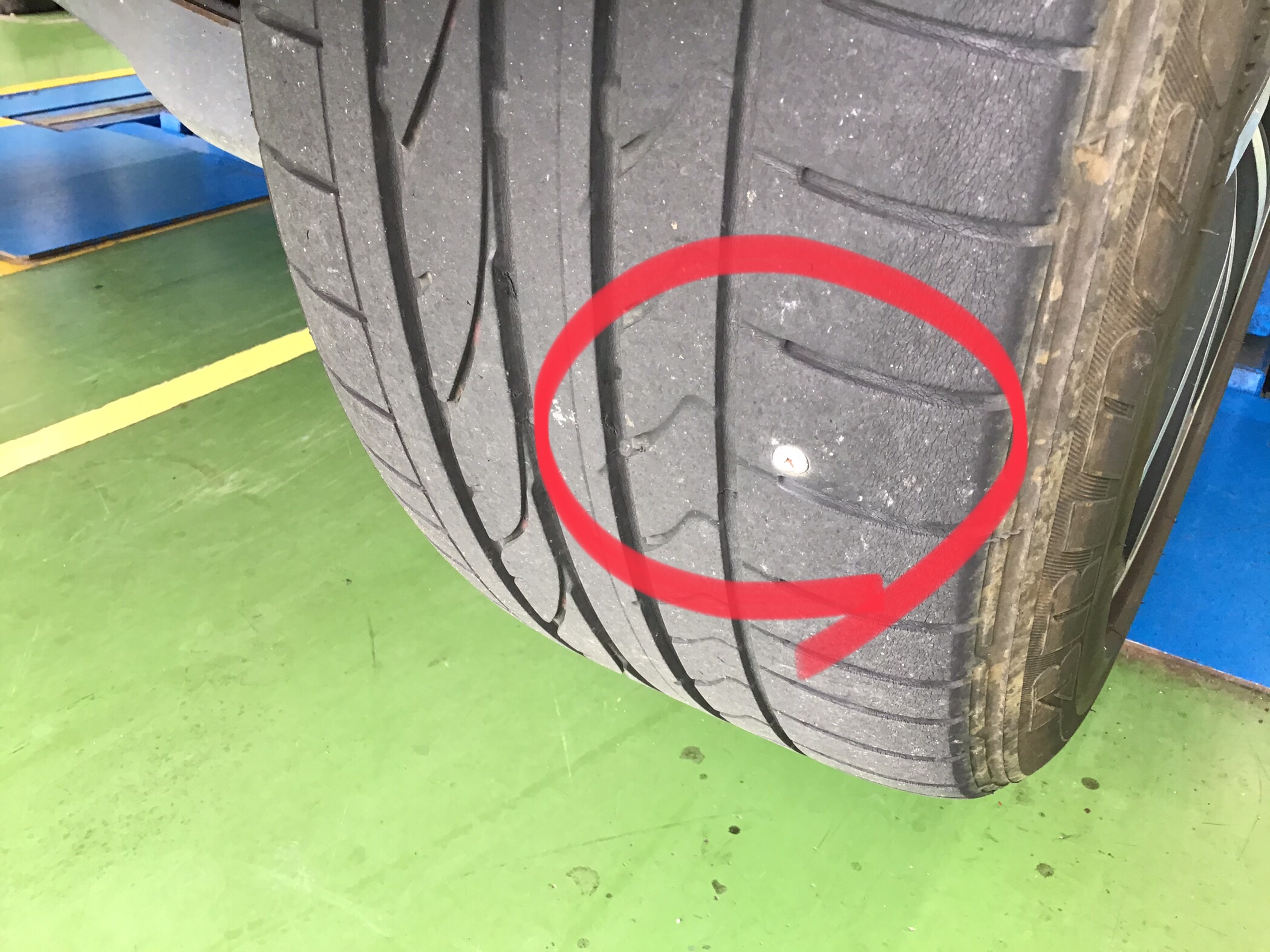 さらに、右の後ろのタイヤに釘が刺さってしまっている