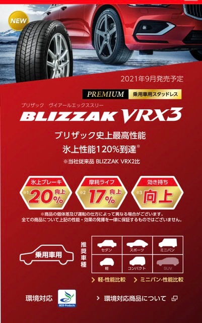いよいよ発売☆彡 ポスト 2021年9月4日 こんにちは。9月に入りグッと気温が下がり季節の移り変わりを感じます。 そんな中、先月よりご案内していたブリヂストンのNEW MODELスタッドレスタイヤ 『 ブリザックVRX 3 』がいよいよ発売になりました。 詳しくはこちら! 現物も展示されているのでご検討中であればぜひご来店下さい。 価格や性能のお話はもちろん。 お好みのホイールやレアサイズも安心の早期ご予約も受付中です。
