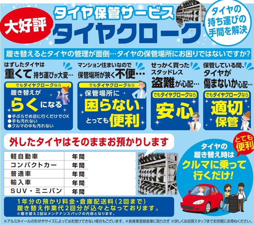 本日はタイヤ保管サービス・脱着メンテナンスパックについてのご案内です。