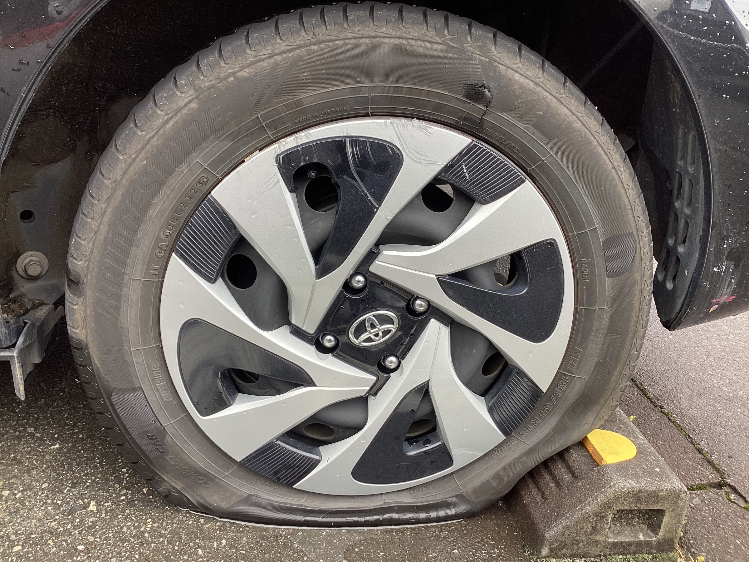 縁石に当ててしまい横が裂けてしまってパンクしてしまっています。