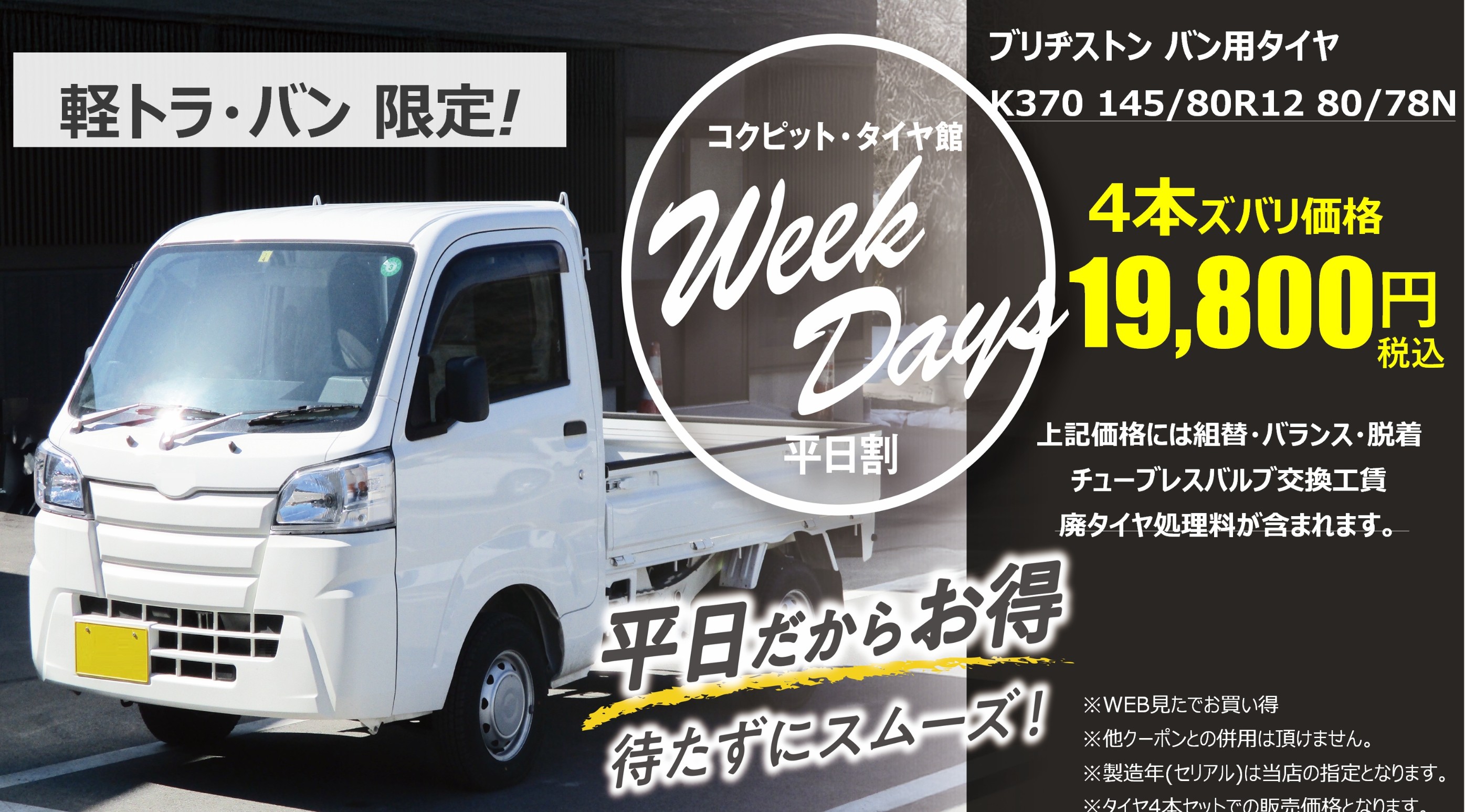 【平日 はじめて 割り】 ♪平日だからお得♪ ~軽トラ編~ ポスト 2026年3月1日 皆様こんにちは! タイヤ館湘南台です!! 軽トラ・バン限定! 月曜日~金曜日の平日限定のキャンペーン 【平日はじめて割り】 始めました!! ※タイヤの製造年はお選びできません。 平日だからお得!なキャンペーンとなります! ご来店、ご相談、ご連絡お待ちしております!! カテゴリ:タイヤ関連 お知らせ