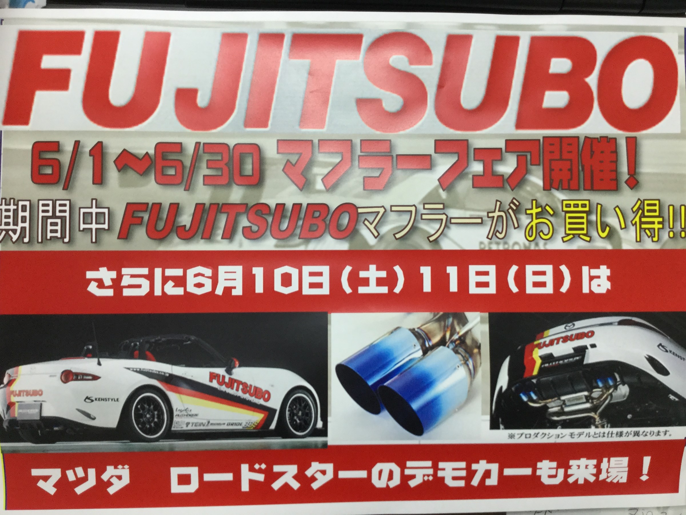 フジツボマフラーフェアー開催中!! ポスト 2017年6月8日 こんにちは!! 毎年恒例!?のフジツボマフラーフェアーが 今年も開催しております!!!! マフラー交換??車検は・・・?うるさいかも・・・・? などなど、皆様が不安なところもマフラーメーカーの フジツボ製なら心配ご無用ですよ!! フジツボさんからデモCARをお借りしてますので 音質・音量のご確認も出来ますよ♪♪ マフラー交換ご検討中の方は是非お立ちよりください!! ご来店お待ちしてます。 担当:たかはし