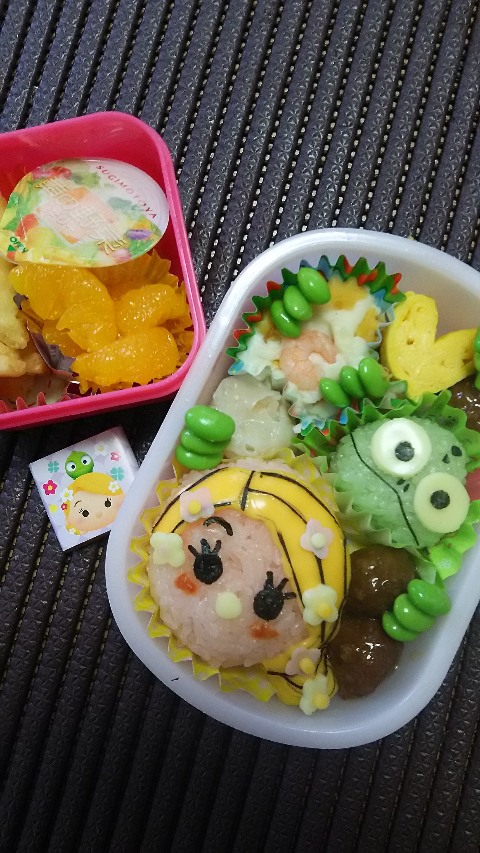 ☆★☆お弁当デー☆★☆ ポスト 2017年6月26日 先日のお弁当デーのリクエストは 「ラプンツェル&パスカル」 ツムツム系ならなんとか可愛く見えるので。。。よし!としよう! 髪の毛に使ったチェダーチーズのスライスはつかえる~ 髪飾りの花は何個も作るし、意外と細かい。。。 でも、喜んでくれたから母はまた作ってしまう。。。 担当:MAMAサン
