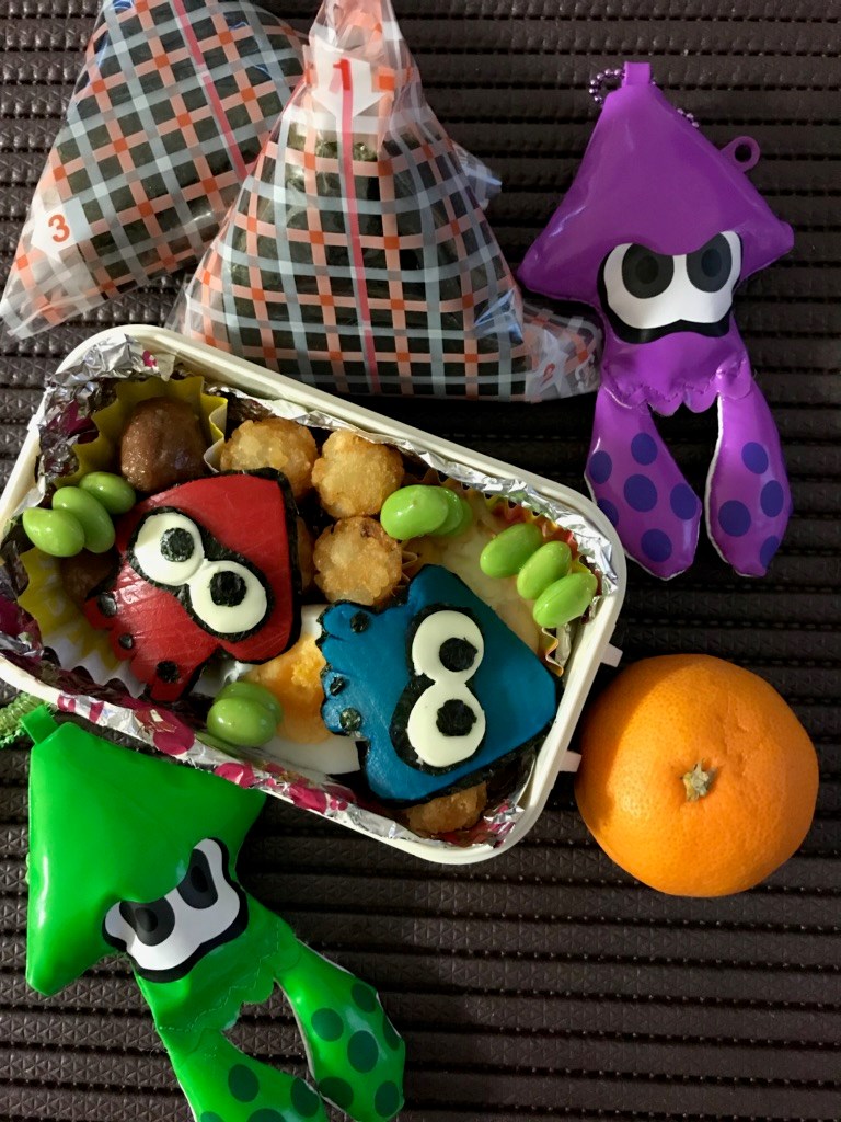 ★☆★キャラ弁★☆★ ポスト 2017年12月2日 先日、小学校の市内めぐりがありました。 お弁当持参だったので食べやすいおにぎりを持たせれば。。。 と思っていたら、なんでもいいからキャラ弁にして。。。。 わぁ。。。でた! 基本ごはんをなんかのキャラにする。。。でやってきたのでおかずでキャラは やっぱり難しい! 考えついた答えは、通常のおかずにキャラをちょこと。 「スプラトゥーン」というゲームのカラフルなイカにしました。 寒かったけど外で食べたみたいです。 担当:MAMAサン