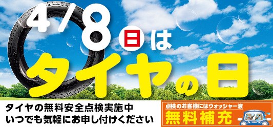 今日は何の日? ポスト 2018年4月8日 本日、4月8日は、4つの輪(8)と言う事で『タイヤの日』なんですよ!! 普段タイヤに無関心な方も、この機会にタイヤの点検しましょう! もちろん点検は無料です! お気軽にご来店下さい。 担当:ナルサカ