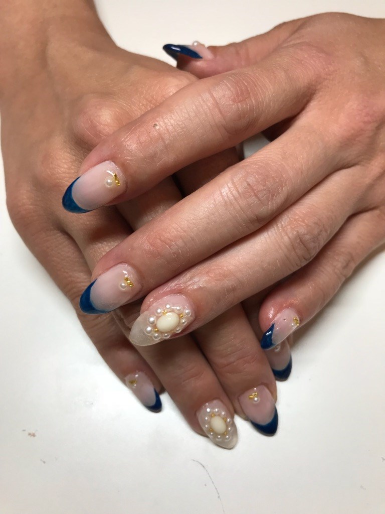 パーティードレスがネイビーとのことでネイビーフレンチにポイントでパールで埋め尽くしました。
