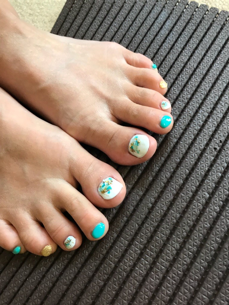 ◎○夏ネイル○◎ ポスト 2018年5月26日 MAMA友にネイルしましたぁ!!!! 夏を先取り*。ヾ(。>v<。)ノ゙*。 サンダルの季節☆フットネイルしておしゃれを楽しもう♪ ホワイトにブルー系のシェル(貝)を埋め込みました。 ゴールドとターコイズブルーが夏っぽい☆ 担当:MAMAサン