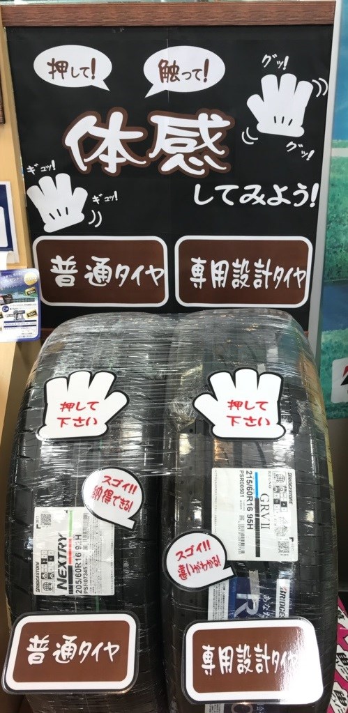 実際に通常タイヤとミニバン専用タイヤの違いを体感できるコーナーもご用意。