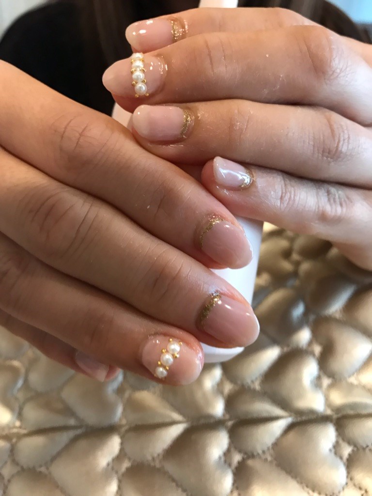 かわ.゚+.(´∀`*).+゚.ぃぃ 大人ネイル ポスト 2018年6月11日 休みの日は私の趣味にお付き合いしてくれるMAMA友。。。 今回は仕事でネイルOKだけど、ハデハデはNG!!!ってことで シンプルなベージュ系におとなしめのゴールドライン。 パールを1本だけのせて、大人なネイルになりましたぁ★ 担当:MAMAサン