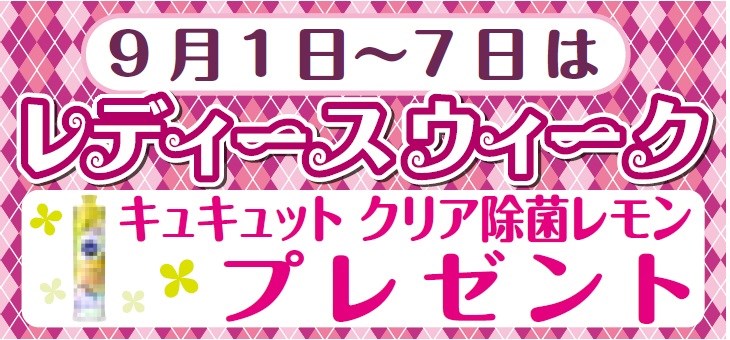 今月もレディースウィーク開催してます! ポスト 2018年9月1日 毎月1日~7日開催のレディースウィーク開催しております。 女性のお客様ご来店でプレゼントをお渡ししております。 今月は・・・ ★キュキュット クリア除菌レモン★ ※数に限りがあります。無くなり次第終了となります。 担当:ナルサカ
