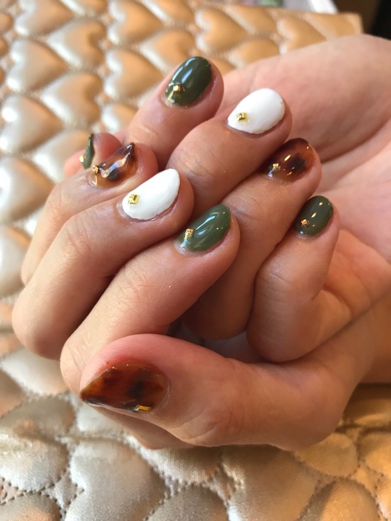 かわ.゚+.(´∀`*).+゚.ぃぃ 秋ネイル ポスト 2018年9月10日 こんにちゎ☆ ファッションはさきどり???気温もまだまだ30度以上あるし。。。 でも9月。。。季節は秋! 秋の可愛いネイルの定番! 『べっ甲ネイル&カーキ』にしましたぁ☆ 担当:MAMAサン