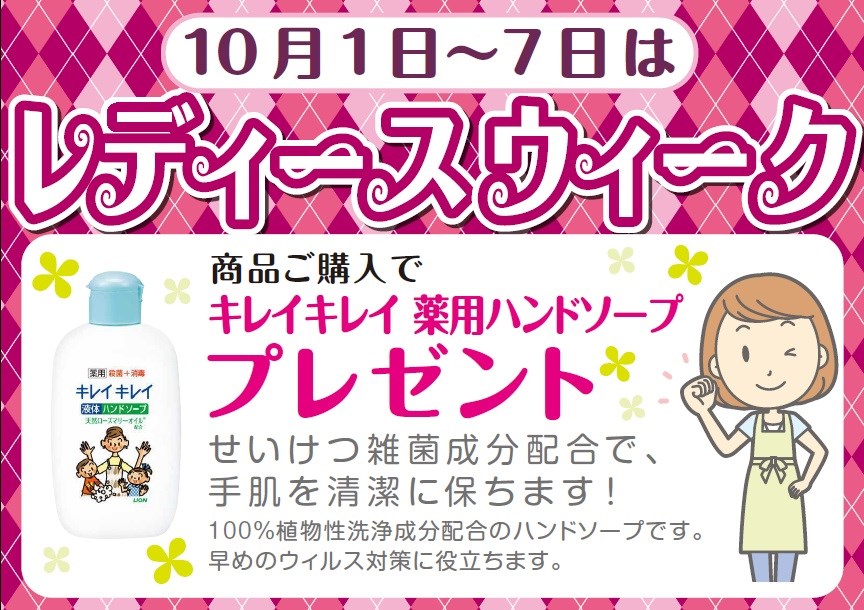 毎月恒例レディースウィーク開催中! ポスト 2018年10月1日 今月もレディースウィーク開催しております! 今月のレディースウィークのプレゼントはこちら↓ ★キレイキレイ 薬用ハンドソープ★ ※数に限りがありますので、無くなり次第終了となります 担当:ナルサカ