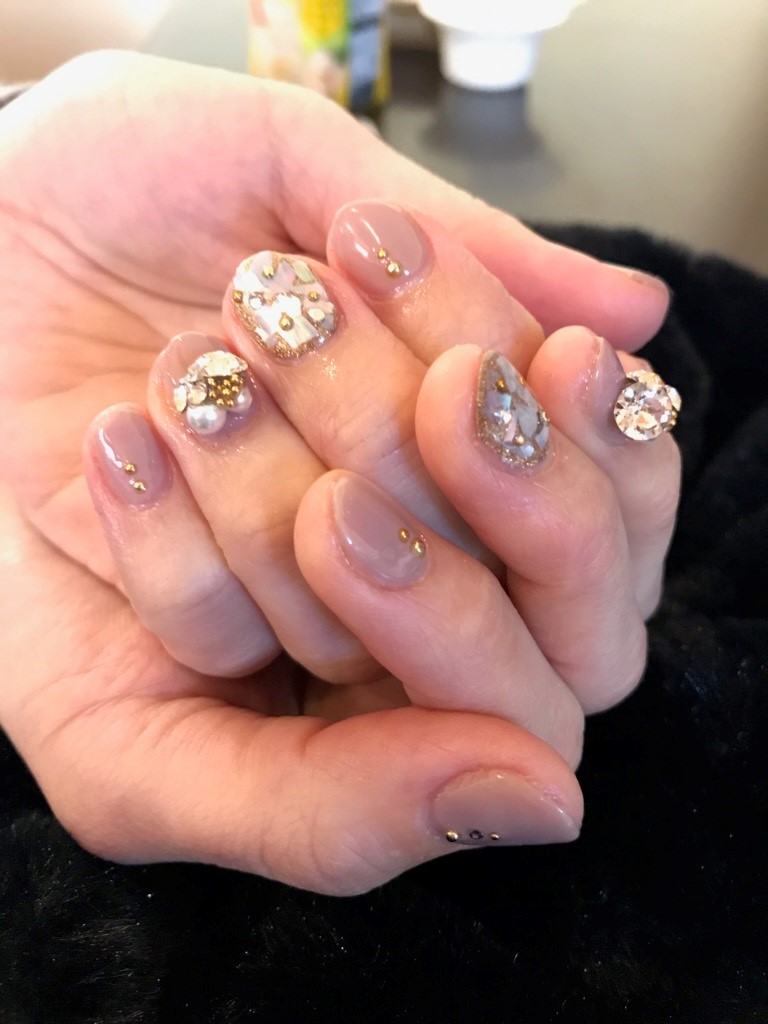 カワ(・∀・)イイ!! 春ネイル☆彡 ポスト 2019年3月2日 ベージュカラーにゴールドビリオン ホワイト系のシェルを埋め込んでポイントに先日習得した3Dスワロを取付ました。 インパクトがあるのにとっても品があって友達の雰囲気にバッチリ合っていましたぁ☆彡 担当:MAMAサン
