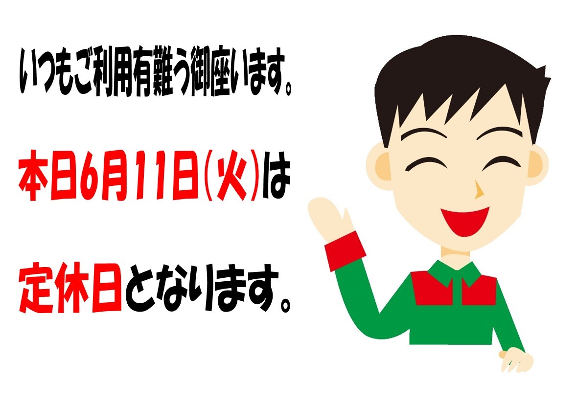 本日定休日となります。 ポスト 2019年6月11日 いつもお世話になっております。 本日6月11日(火)は定休日となります。 ご迷惑をお掛けいたします。 尚、12日(水)は10:00~18:30通常営業いたします。 よろしくお願い致します。 担当:ナルサカ