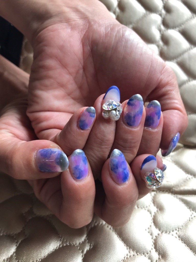 カワ(・∀・)イイ!!夏ネイル☆彡 ポスト 2019年6月12日 休みの日の楽しみは趣味のネイルです。 この日もMAMA友が来てくれてアジサイ風の青と紫で先端をシルバーにしてみました。 薬指はブルーの細めのフレンチにして大好きなスワロの3Dパーツをのせましたぁヾ(≧▽≦)ノ 担当:MAMAサン