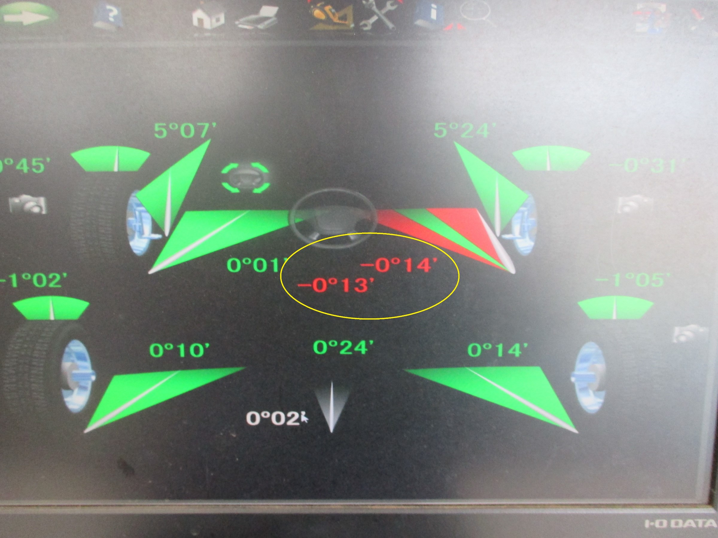 「調整はしていない」との事でアライメント測定をいたしました!測定をしてみると右前が外側を向いてしまっております。